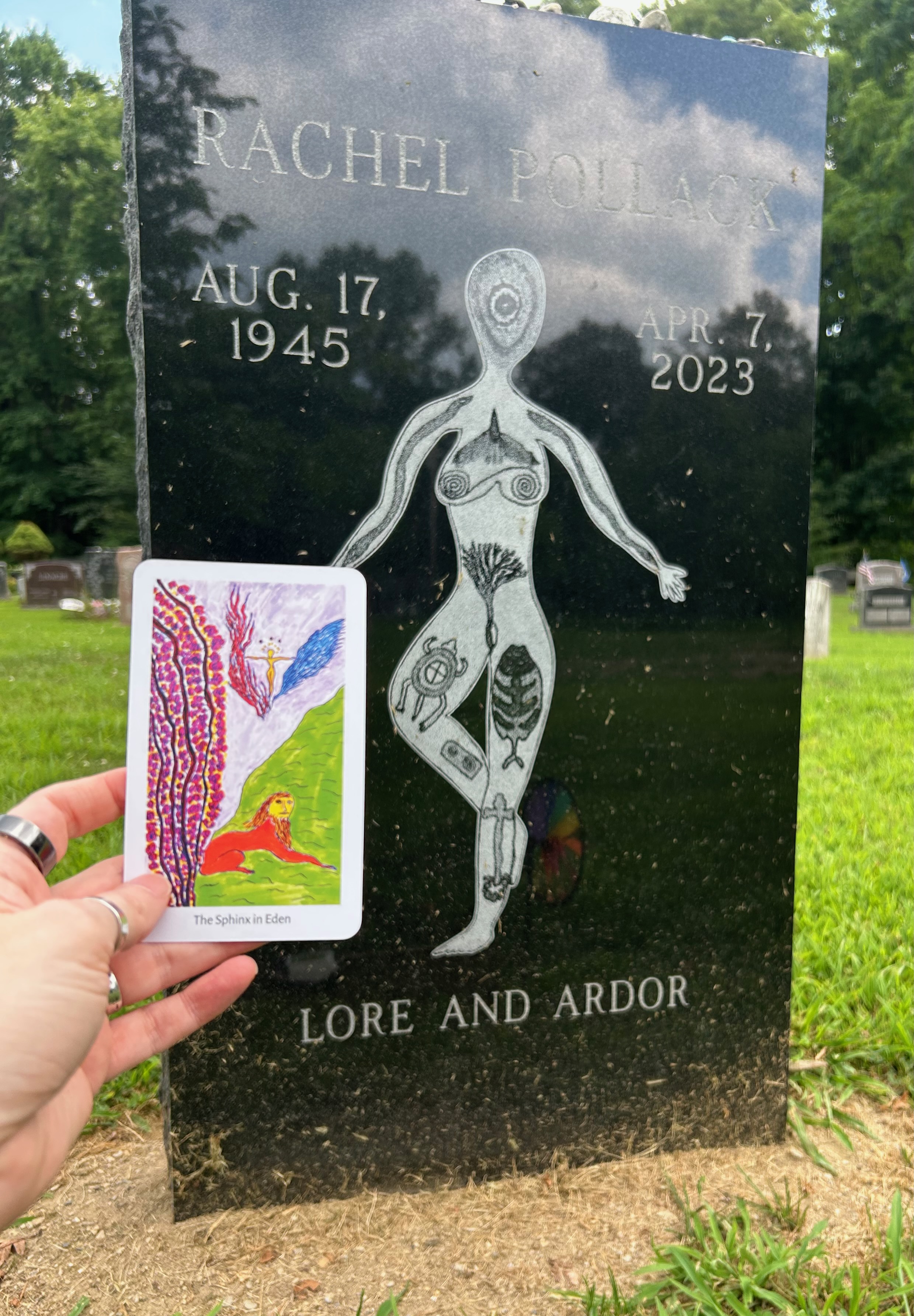 The first of those cards, drawn while sitting in front of her memorial, was a new card she added for the most recent edition: The Sphinx in Eden. She says about this card: