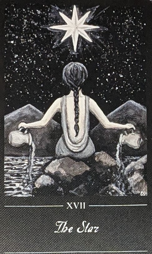 To me, this card presents a space of sacred androgyny. Two pitchers, perhaps just water, perhaps the fluids of life. A suggestion of the balance of two forces, without a lean towards one or the other. A bright star overhead, lighting the landscape as one reflects. An “opening of hearts” and of minds, a space to exist comfortably as you are.
